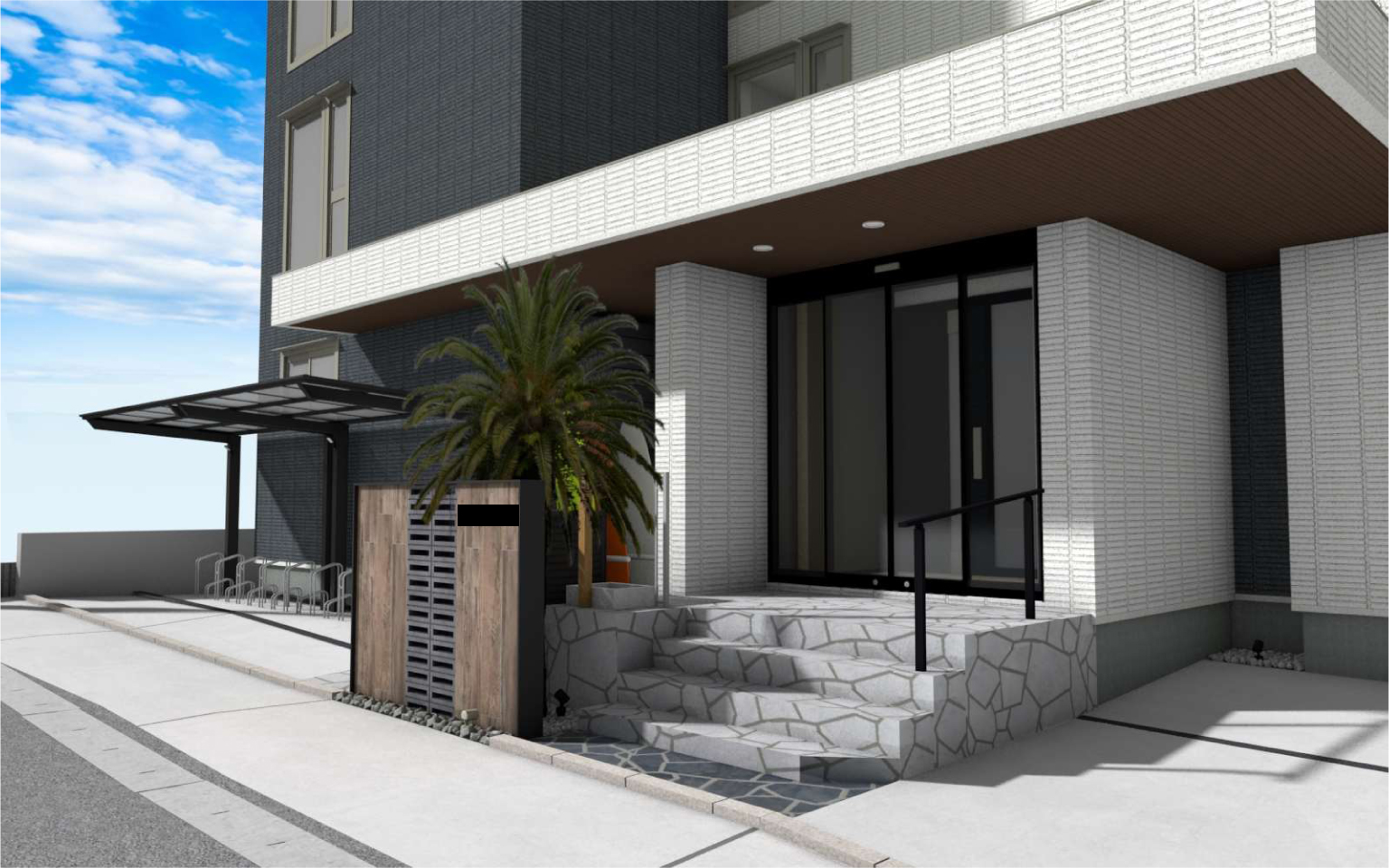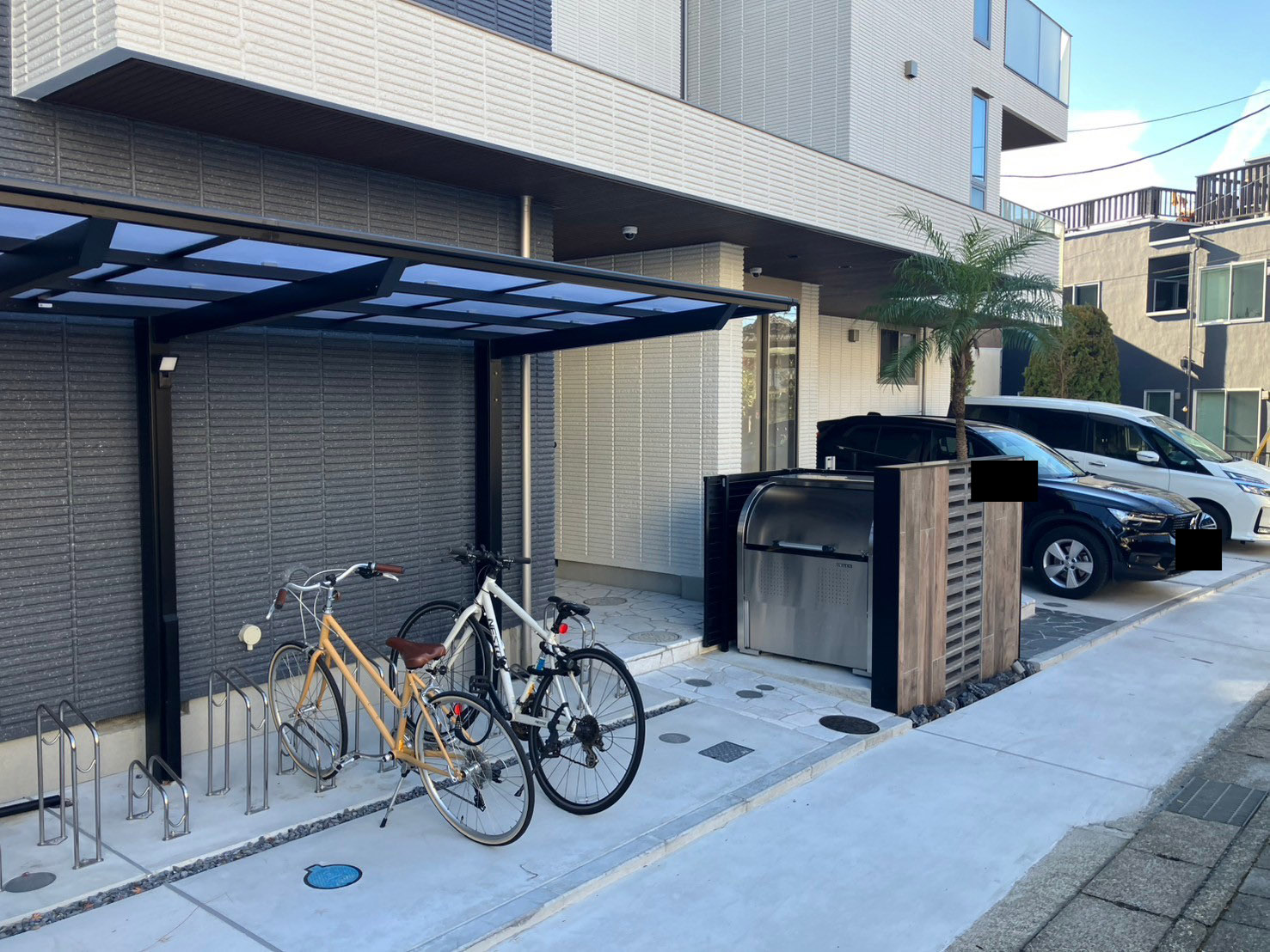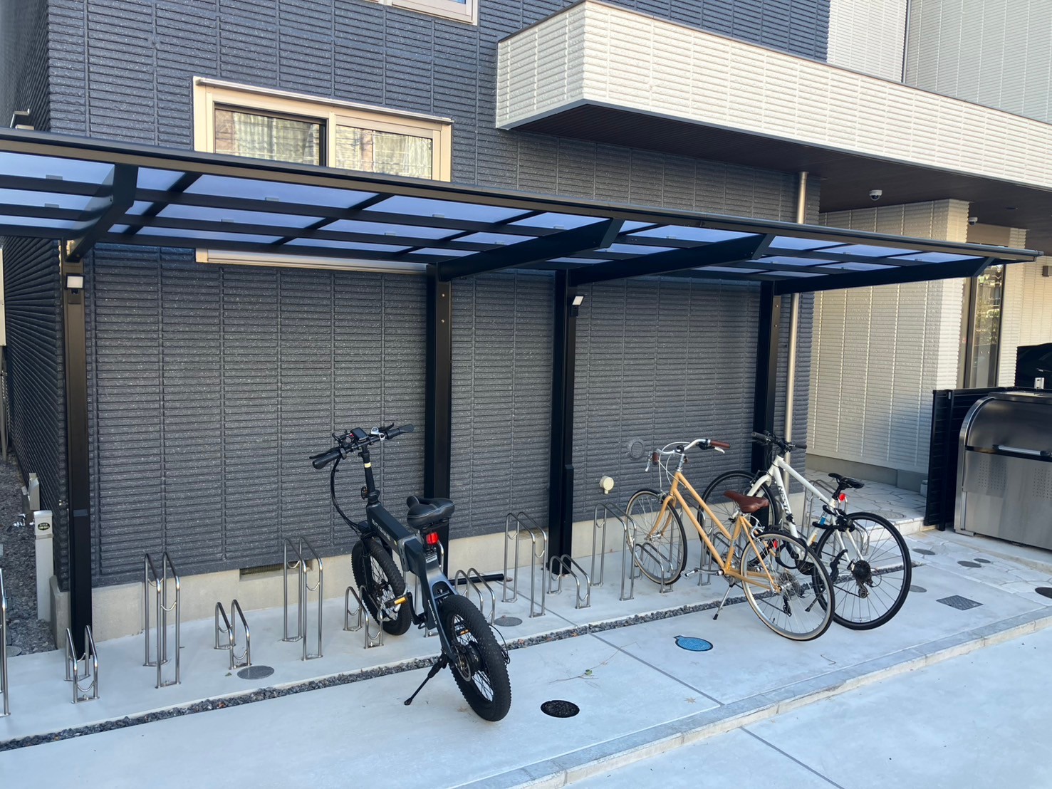 新築外構、門柱、タイル、カーポート、サイクルポート